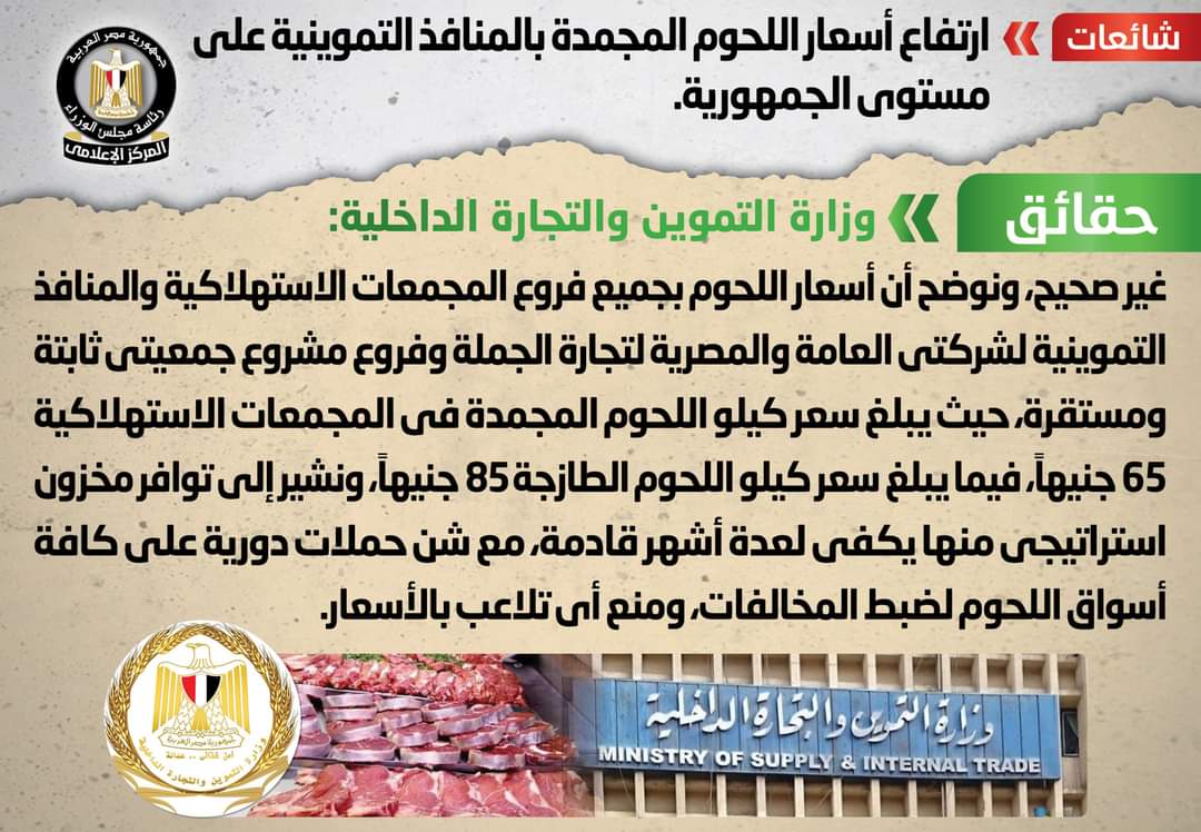 وتواصل المركز الإعلامي لمجلس الوزراء مع وزارة التموين والتجارة الداخلية، والتي نفت تلك الأنباء، مُؤكدةً أنه لا صحة لارتفاع أسعار اللحوم المجمدة بالمنافذ التموينية على مستوى الجمهورية، مُوضحةً أن أسعار اللحوم بجميع فروع المجمعات الاستهلاكية والمنافذ التموينية لشركتي العامة والمصرية لتجارة الجملة وفروع مشروع جمعيتي ثابتة ومستقرة، حيث يبلغ سعر كيلو اللحوم المجمدة في المجمعات الاستهلاكية 65 جنيهاً، فيما يبلغ سعر كيلو اللحوم الطازجة 85 جنيهاً، مُشيرةً إلى توافر مخزون استراتيجي منها يكفي لعدة أشهر قادمة، مع شن حملات دورية على كافة أسواق اللحوم لضبط المخالفات، ومنع أي تلاعب بالأسعار.