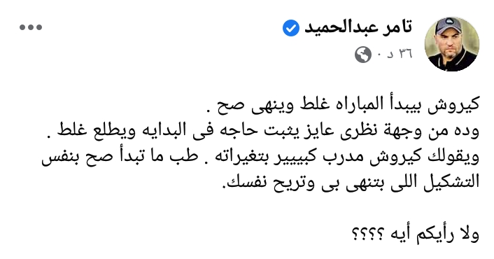 كتب "تامر" عبر صفحتة على موقع التواصل الإجتماعى "فيس بوك" قائلا: كيروش بيبدأ المباراه غلط وينهى صح..ده من وجهة نظرى عايز يثبت حاجه فى البدايه ويطلع غلط.. ويقولك كيروش مدرب كبير بتغيراته.. طب ما تبدأ صح بنفس التشكيل اللى بتنهى بى وتريح نفسك.