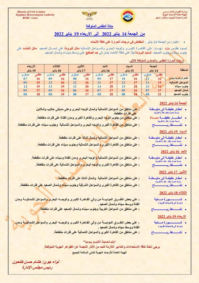 يتوقع خبراء الهيئة العامة للأرصاد الجوية، أن يسود الأسبوع المقبل طقس بارد نهارًا على القاهـرة الكبـرى والوجه البحري والسواحل الشمالية، مائل للبرودة على شمال الصعيد، مائل للدفء على جنوب سيناء وجنوب الصعيد، شـديد البرودة ليلًا على كافة الأنحاء، يصل إلى حد الصقيع على وسط سيناء وشمال الصعيد.