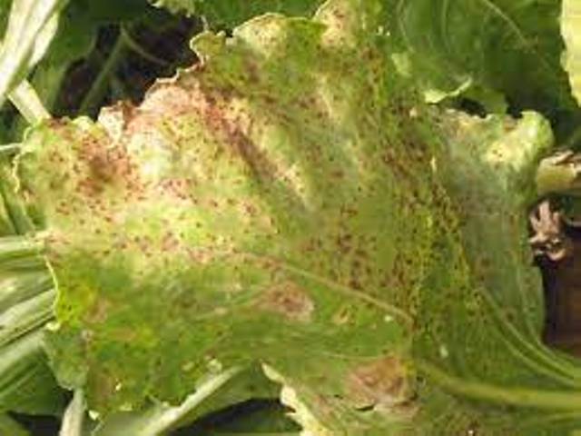 وتظهر الاعراض علي الأوراق الكبيرة في صورة بقع صغيرة دائرية ثم نتشر علي باقي الاوراق وهي محاطة بلون أرجواني أو بنفسجي ومع تقدم المرض تندمج هذه البقعة مع بعضها مكونة منطقة كبيرة ميتة وتحف وتسقط وفي نهاية الاصابة تظهر الاوراق وكأنها محروقة.