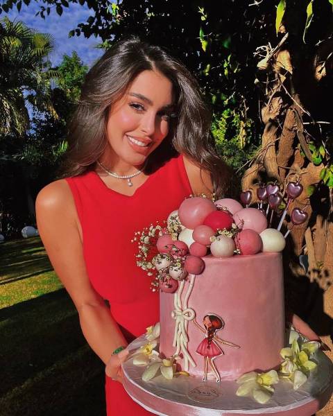 ظهرت ياسمين بإطلالة رايقة جذابة. ترتدي فستاناً باللون الأحمر. وتحمل التورتة باللون الوردي وبها مجموعة من البلالين الملونة.پ