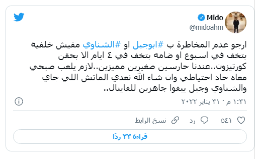 ونشر ميدو من خلال حسابه الشخصي بموقع التواصل الإجتماعي "تويتر": "ارجو عدم المخاطرة ب ابوجبل او الشناوي مفيش خلفية بتخف في اسبوع او ضامه بتخف في ٤ ايام الا بحقن كورتيزون..عندنا حارسين صغيرين مميزين..لازم يلعب صبحي معاه جاد احتياطي وان شاء الله نعدي الماتش اللي جاي والشناوي وجبل يبقوا جاهزين للفاينال".