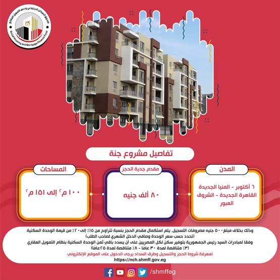 أعلنت وزارة الإسكان والمرافق والمجتمعات العمرانية، فتح صندوق الإسكان الاجتماعي ودعم التمويل العقاري، باب الحجز لوحدات سكنية كاملة التشطيب، وذلك فى مشروعات سكن مصر ودار مصر وجنه بمساحات مختلفة تتراوح ما بين 100 متر وحتى 150 متر من خلال مبادرة التمويل العقارى بنظام الـ 30 عام وخلال 20 معلومة .
