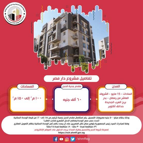 فيما يتعلق بمشروع "دار مصر" فيتضمن طرح وحدات سكنية جاهزة للتسليم الفوري في مدن: